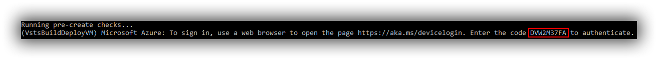 By default this will create a Standard A2 VM running Ubuntu called vstsbuildvm (note that "Container names must be 3-63 characters in length and may contain only lower-case alphanumeric characters and hyphen. Hyphen must be preceded and followed by an alphanumeric character.") in a resource group called VstsBuildDeployRG in the West US datacentre (make sure you use your own Azure Subscription ID). It's fully customisable though and you can see al the options here. In particular I've added the option for the VM to be created with a static public IP address as without that there's the possibility of certificate problems when the VM is shut down and restarted with a different IP address. - Azure now wants you to authenticate. The procedure is explained in the output of the command window, and requires you to visit https://aka.ms/devicelogin and enter the one-time code: