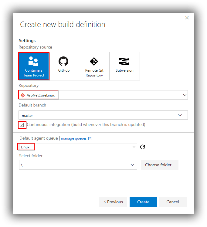 Now the fun part begins. To keep things simple I'm going to run everything from a single build, however in a more complex scenario I'd use both a VSTS build and a VSTS release definition. From the VSTS Build & Release tab create a new build definition based on an Empty template. Use the AspNetCoreLinux repository, check the Continuous integration box and select Linux for the Default agent queue (assuming you create a queue named Linux as I've done):