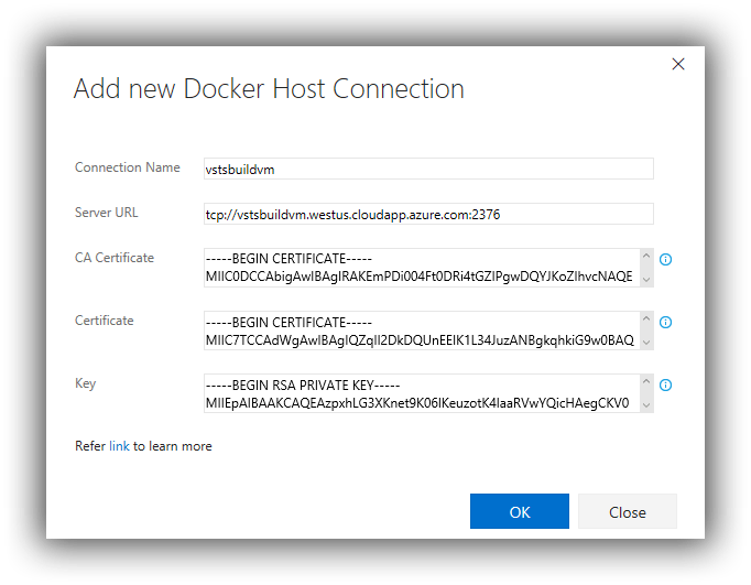 - Key = contents of C:\Users\<yourname>\.docker\machine\machines\<yourvmname>\key.pem.